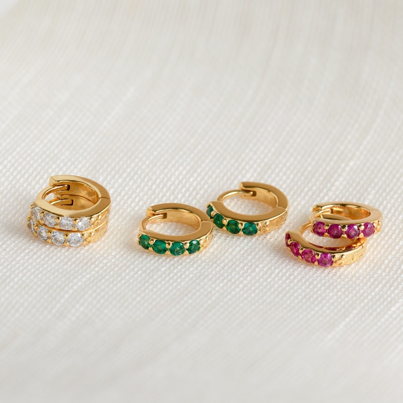 Bundle Set of 3 Save 10%: Includes Clear Crystal, Emerald and Ruby Huggie Earrings