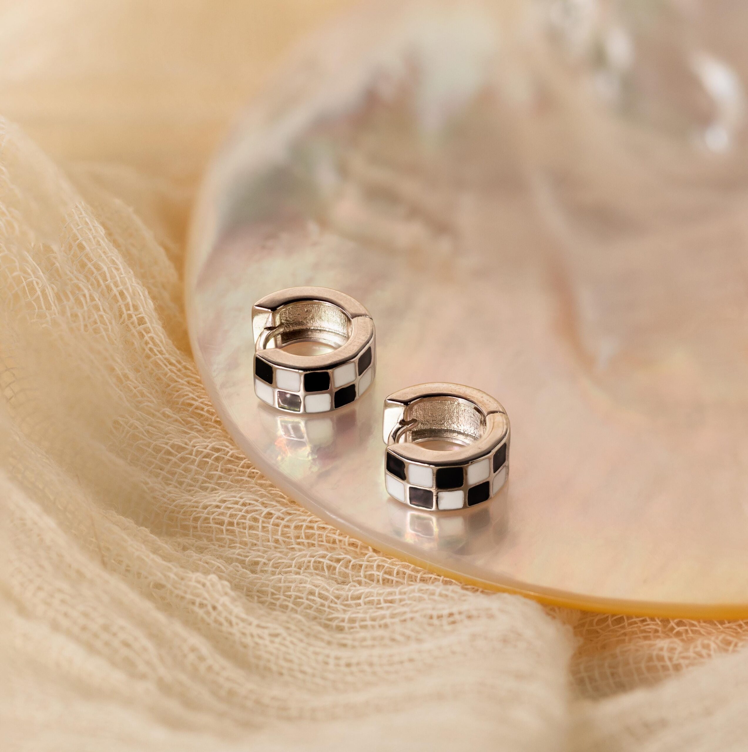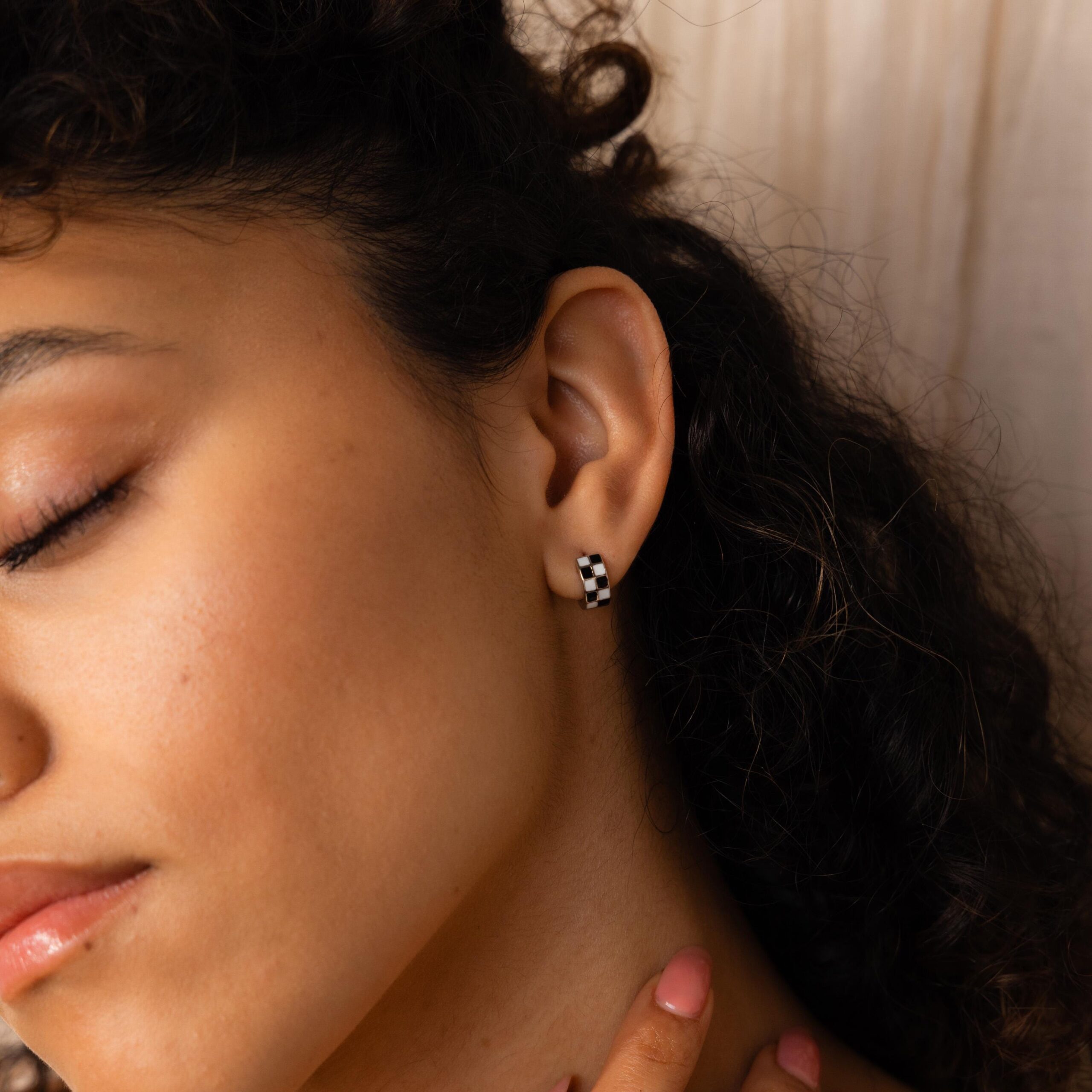 • Featuring Black and White Enamel Covered Checkered Huggie Earrings | Sold as a pair