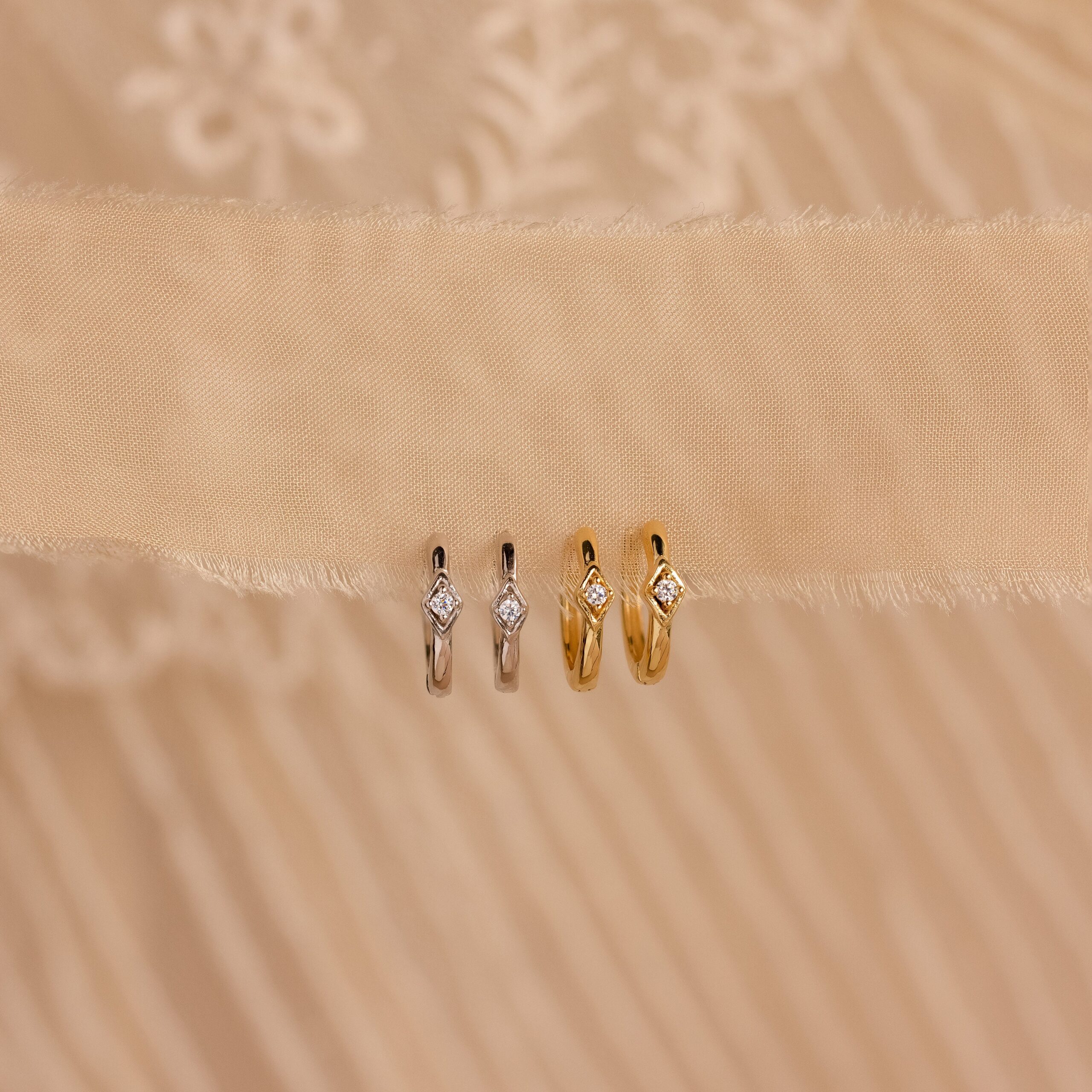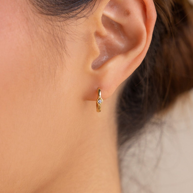 Introducing our minimalist Delicate Diamond Hoop Earrings, featuring a simple and modern huggie design with a round diamond stone set in a geometric bezel. These hoops offer a blend of daintiness and elegance, making them perfect for stacking and matching with your favorite pairs.