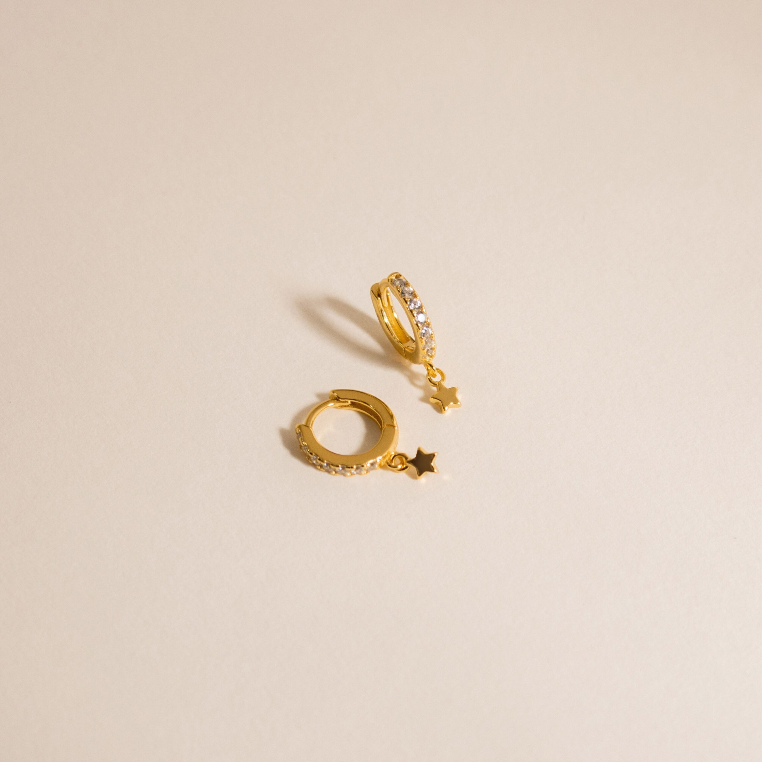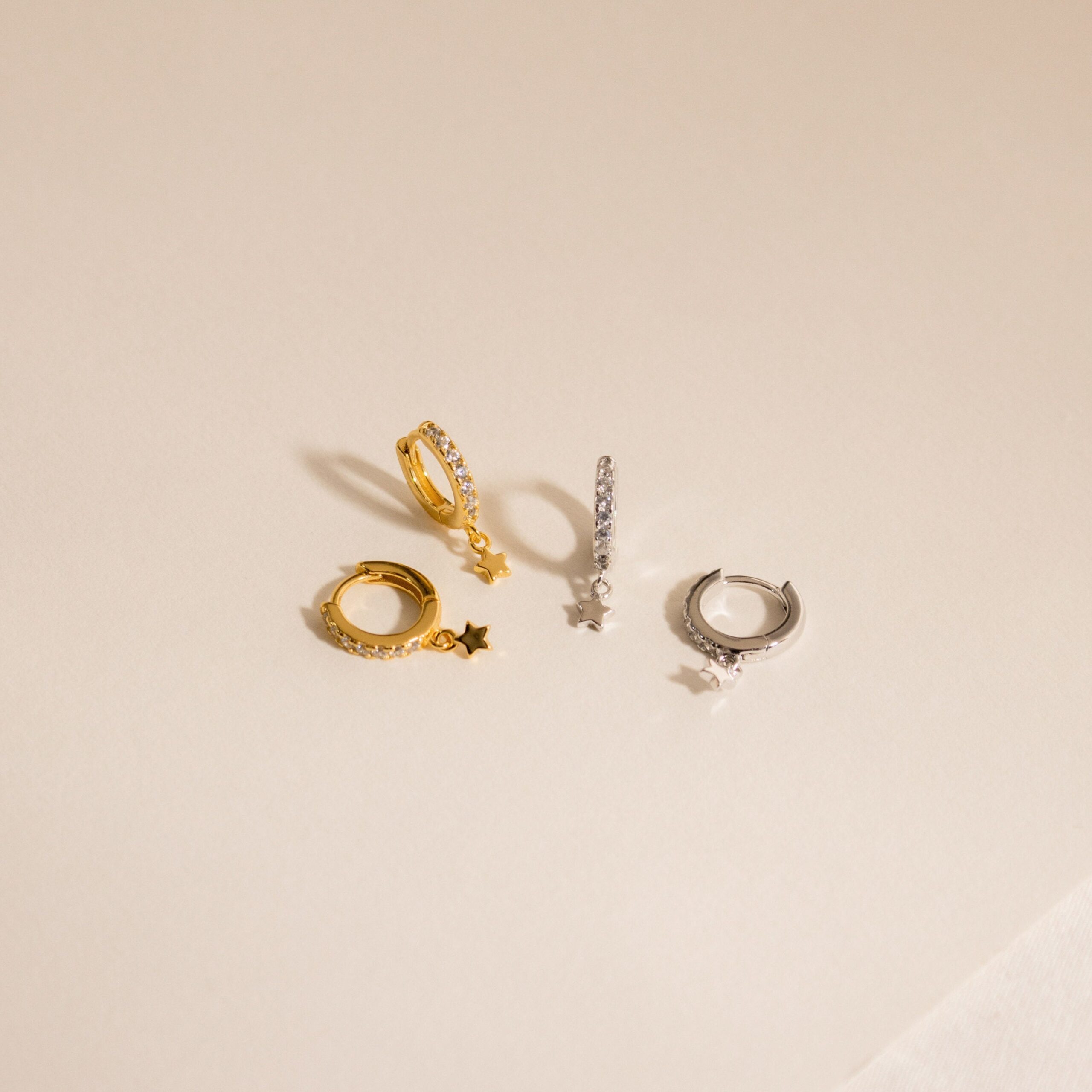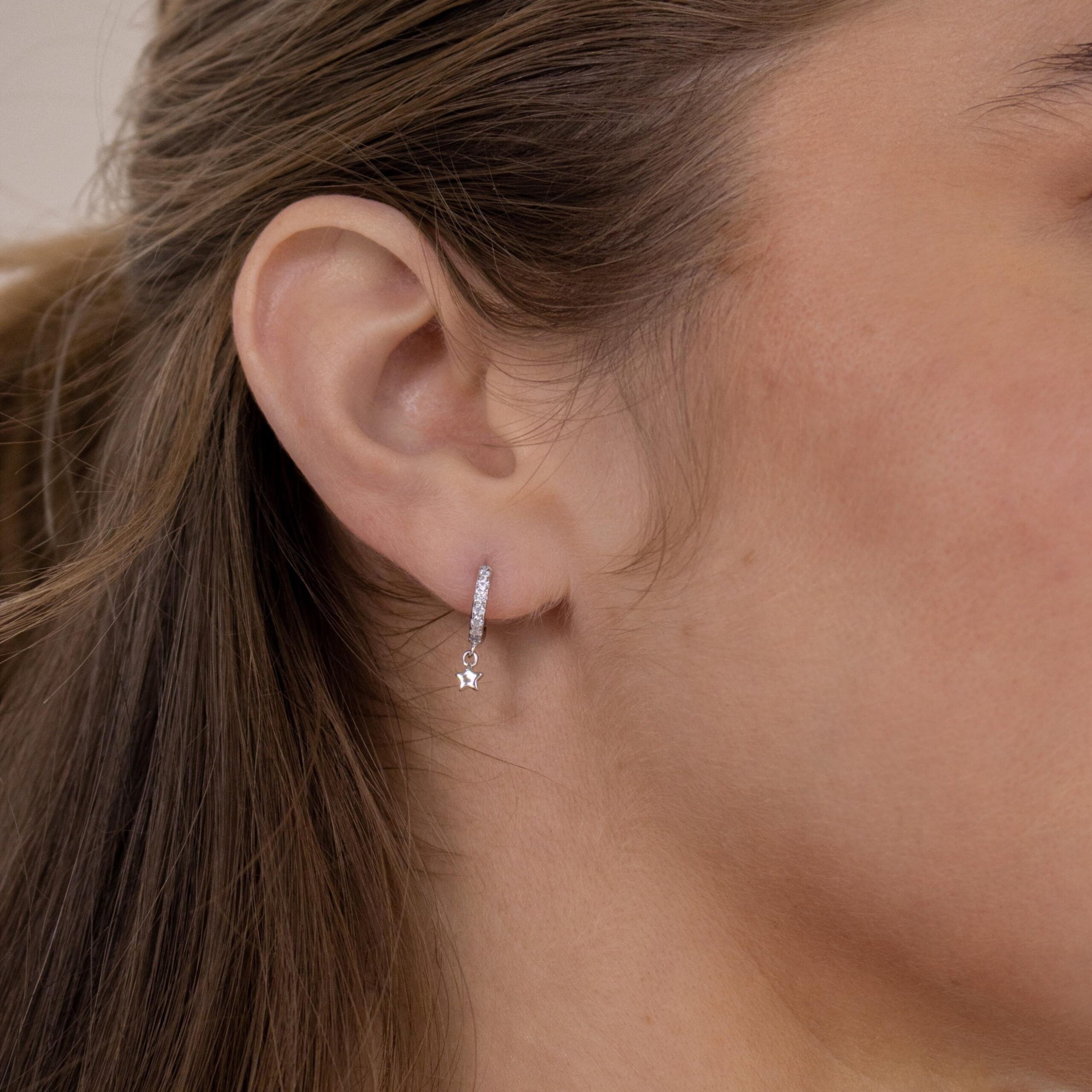 • Featuring 7mm Pave CZ Diamond Huggie Hoops with a 3mm dangling Star Charm.