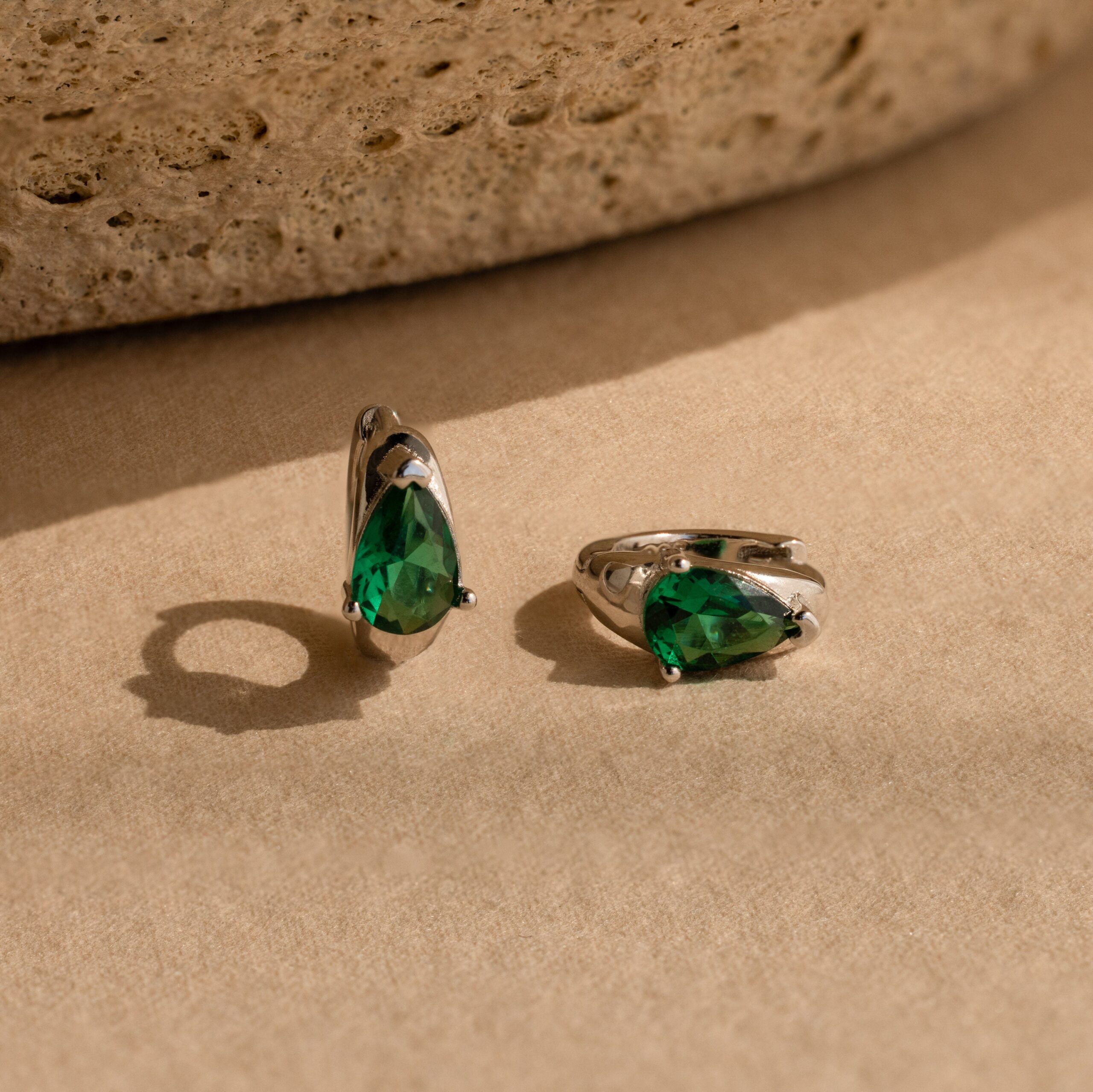 • Featuring dainty Huggie Hoop Earrings with a ~6.5x5mm Teardrop Emerald CZ Gemstone | Sold as a Pair