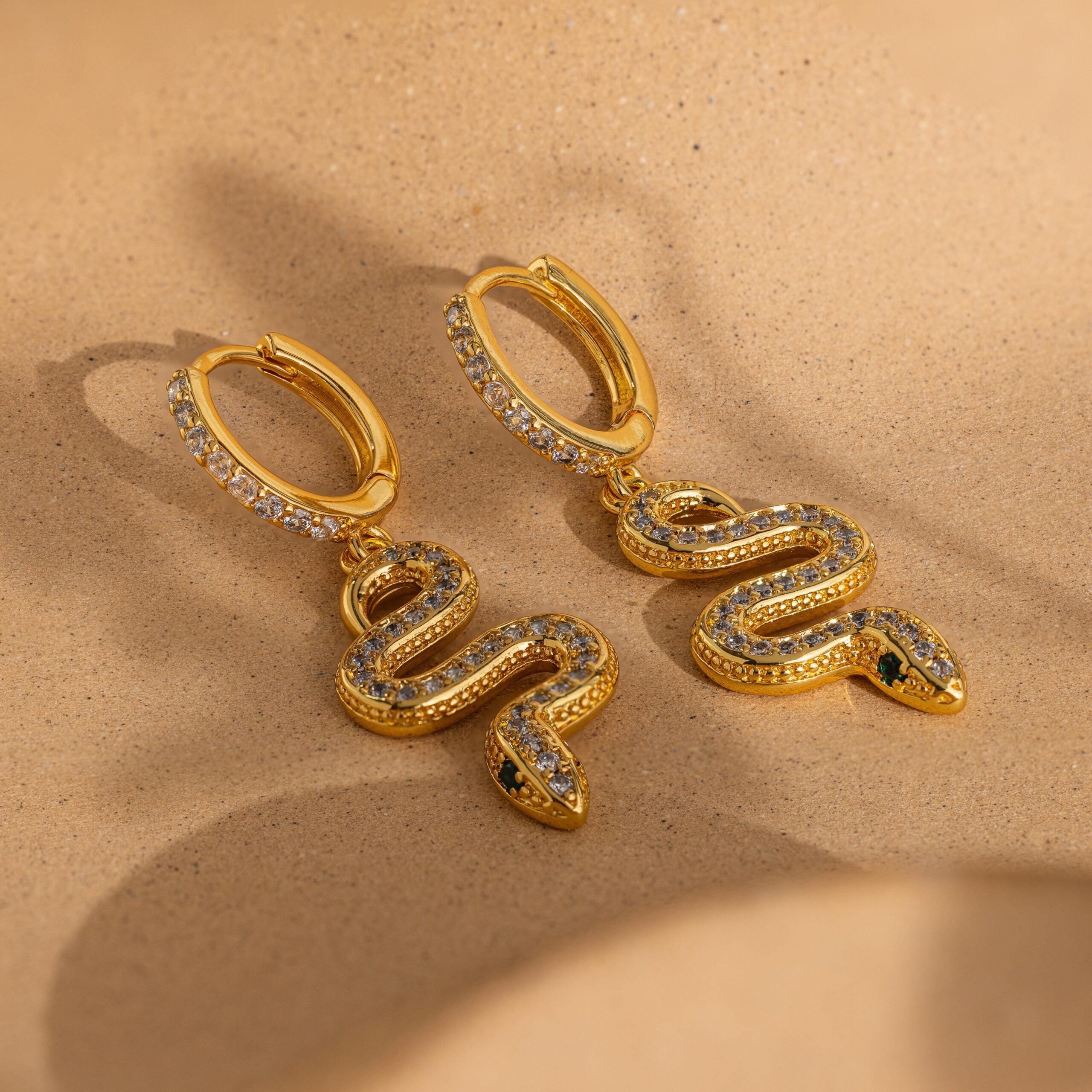 • Featuring ~22mm x 11mm Pave CZ Diamond Snake Huggie Hoops with 2 CZ Emerald Eye Gemstones | Sold as a Pair