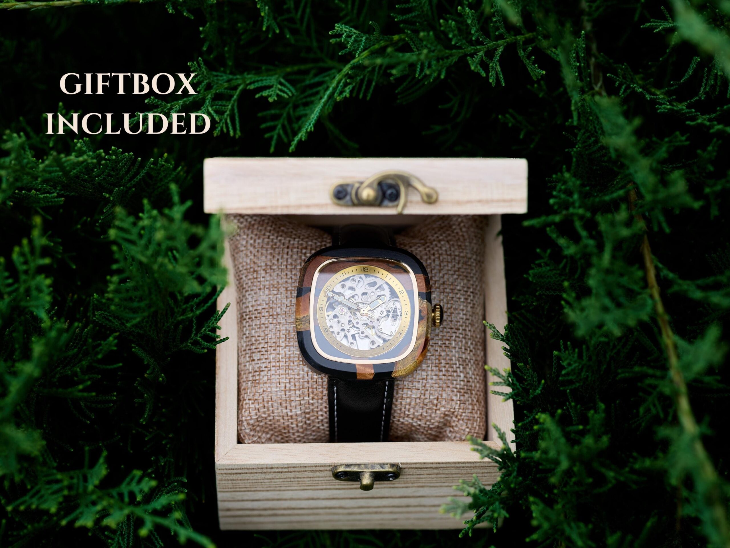 اكتشف التخصيص الممزوج بروح الطبيعة مع هذه الساعة الخشبية المنقوشة، المصنوعة من خشب الزيتون الطبيعي مع لمسة راتنج أسود أنيق. مزودة بآلية حركة أوتوماتيكية، تجمع هذه الساعة بين الوظائف العملية والجماليات الطبيعية الفريدة لتمنح مظهرًا خالدًا وجذابًا.