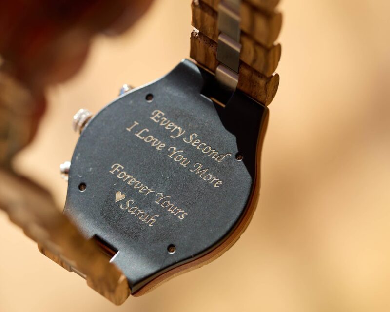 - نقش مخصص: أضف اسمًا، أو أحرفًا أولى، أو تاريخًا، أو رسالة معبّرة على ظهر الساعة.