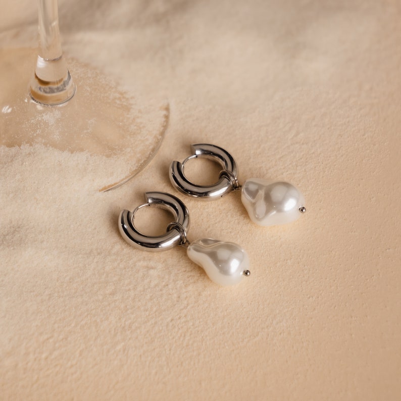 • Featuring Bold Hoop Earrings with a ~20.5x16mm Baroque Pearl Drop Charm | Sold as a Pair