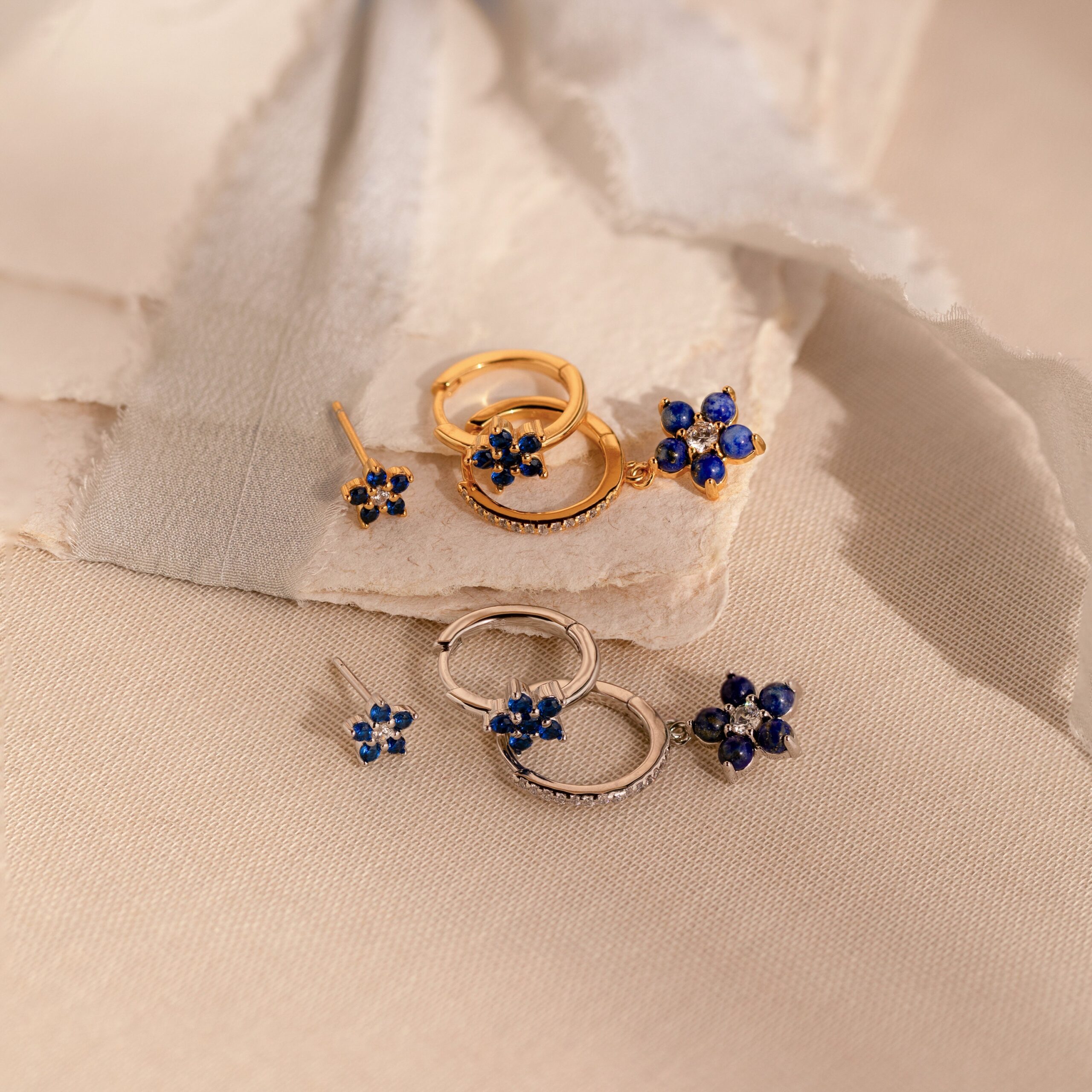 Elevate any ensemble with our Blue Flower Earring Set, a delightful trio consisting of a stud and two hoops, offering versatility to suit your style. With deep blue gemstones exuding elegance and floral motifs adding a touch of youthful charm, this set makes for the perfect anniversary gift, celebrating love with every wear ♡