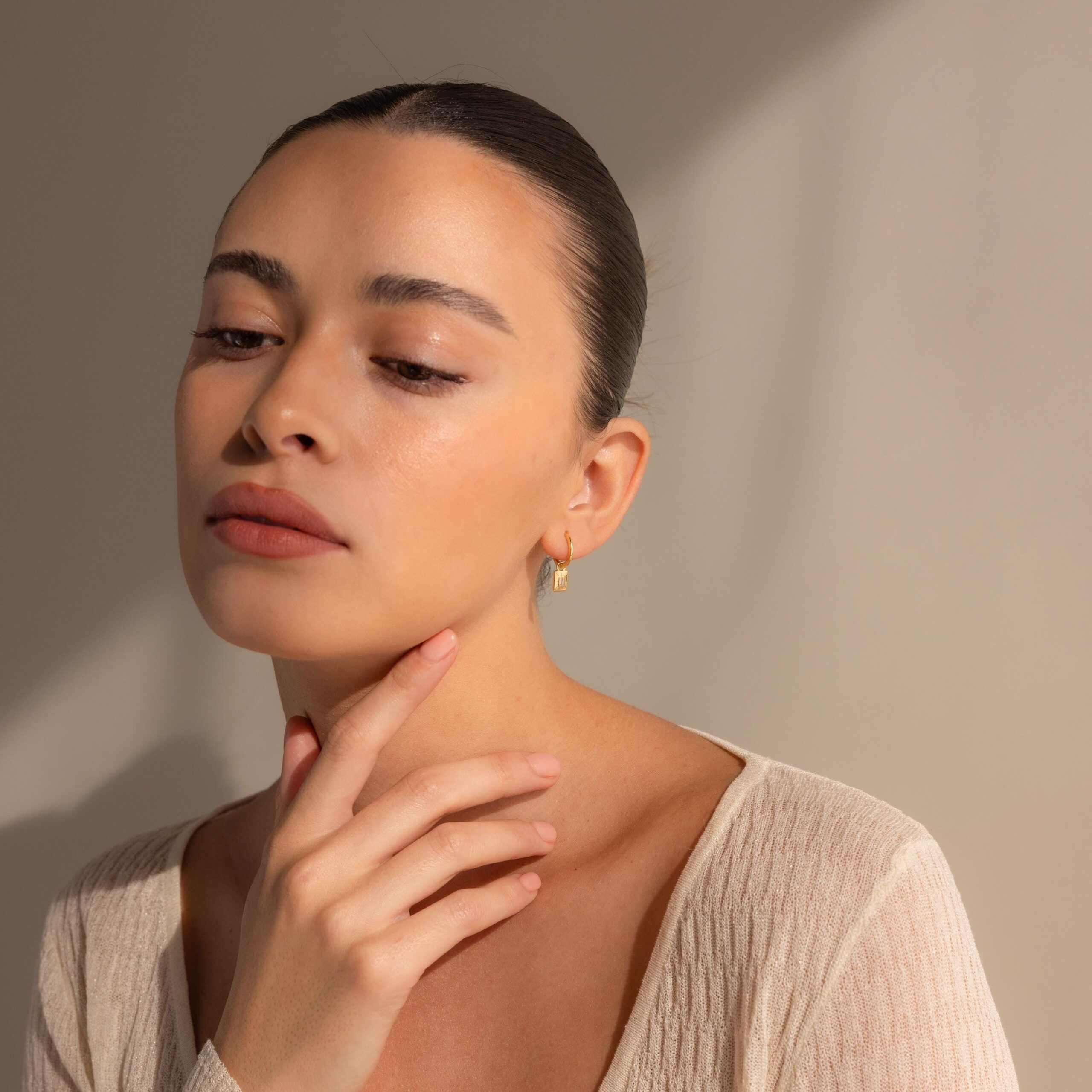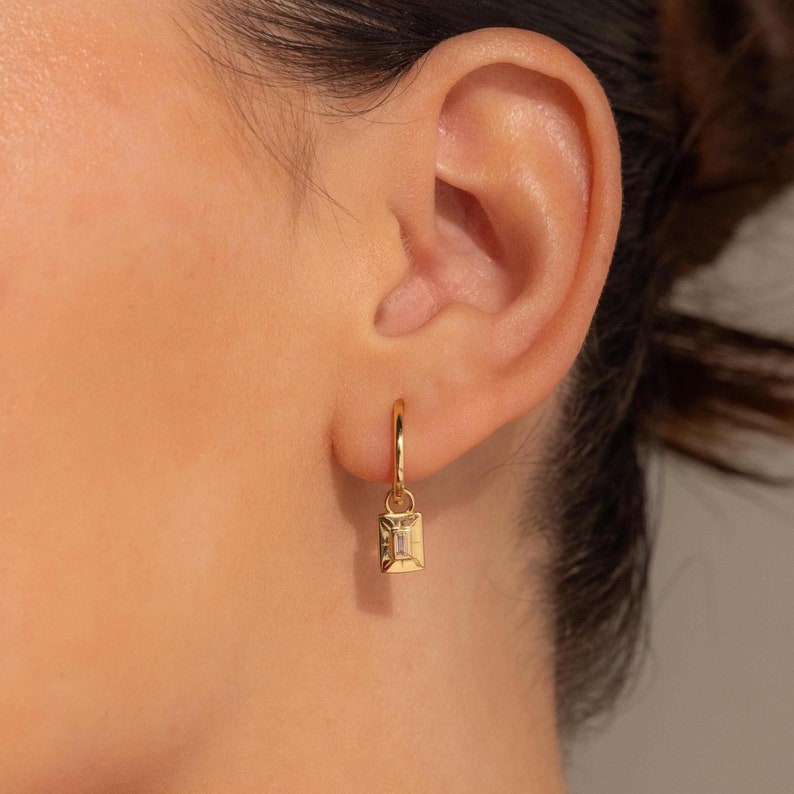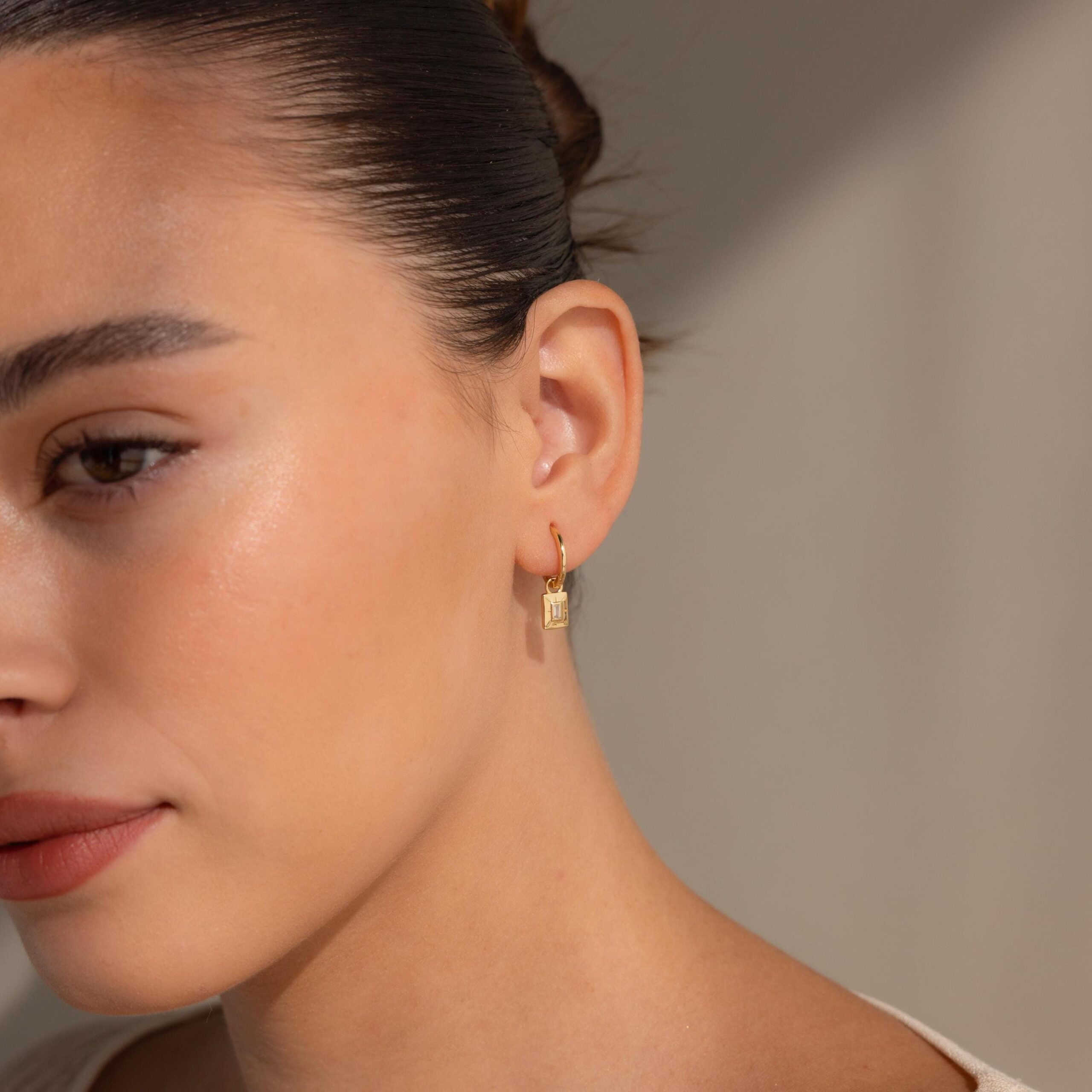 Dainty, dazzling, and undeniably chic – our Diamond Tag Huggies are made to shine bright. Adorned with a striking baguette-cut diamond, these vintage-inspired hoops add just the right amount of elegance and sparkle to any outfit. Whether you’re dressing up for a night out or adding some flair to your everyday look, these dainty hoops strike the perfect balance between trendy and timeless.