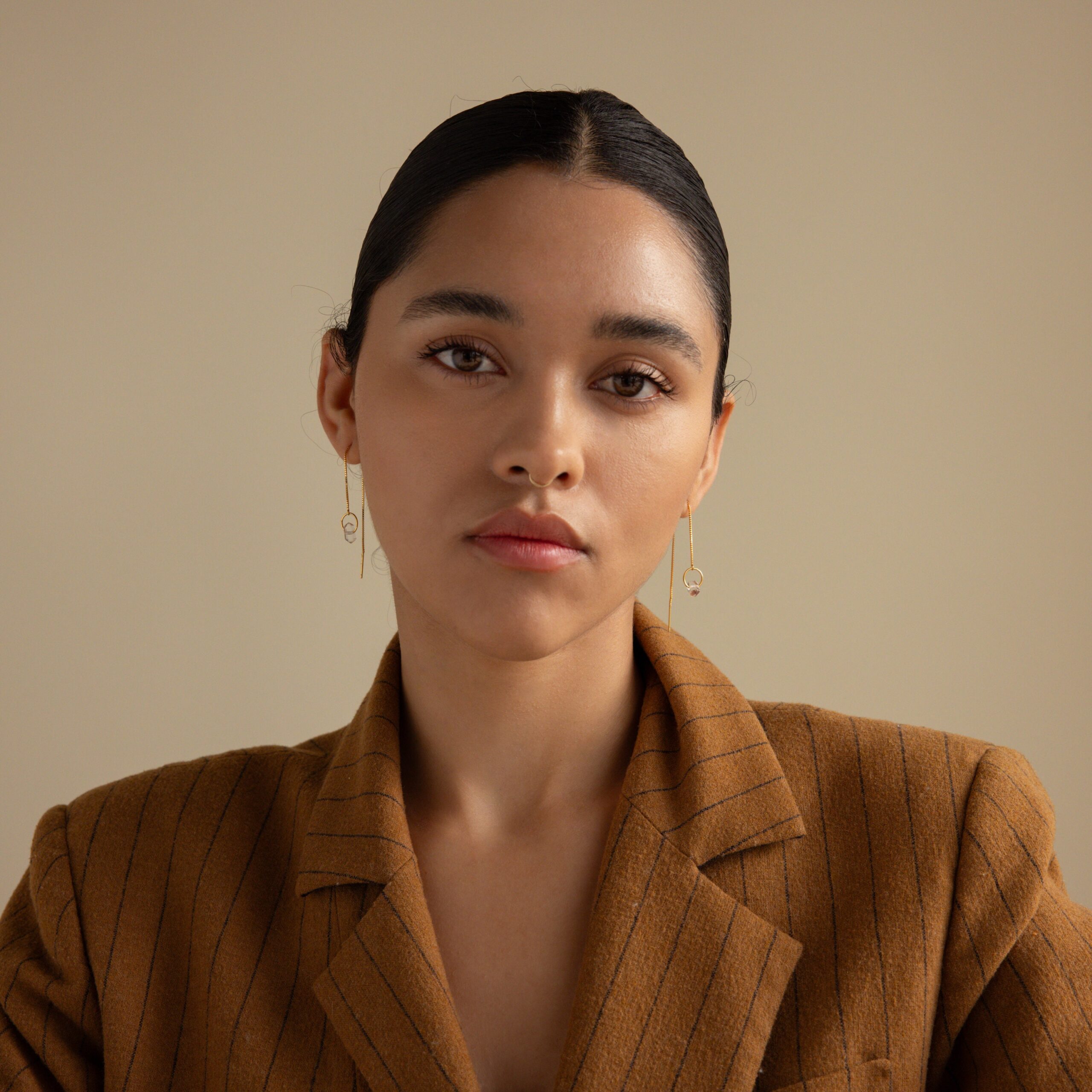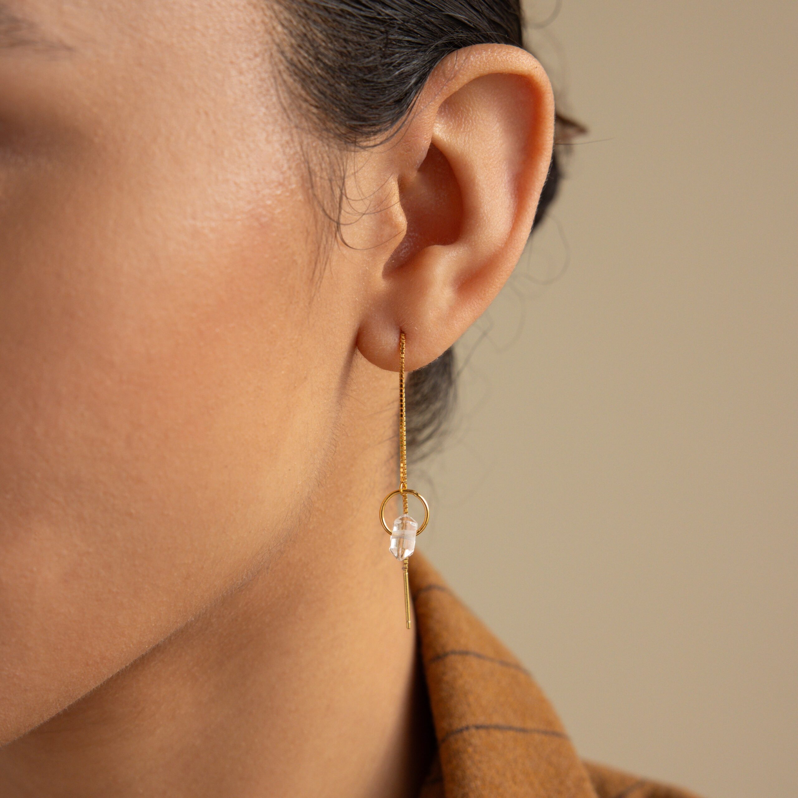 Our Herkimer Chain Earrings are nothing like you’ve seen before! The many delicate elements coming together to form beautiful dangling charm earrings are one of a kind. The Herkimer Diamond within a dainty hoop and attached to a long box chain allow for these threader earrings to be unique, yet pair with almost anything.
