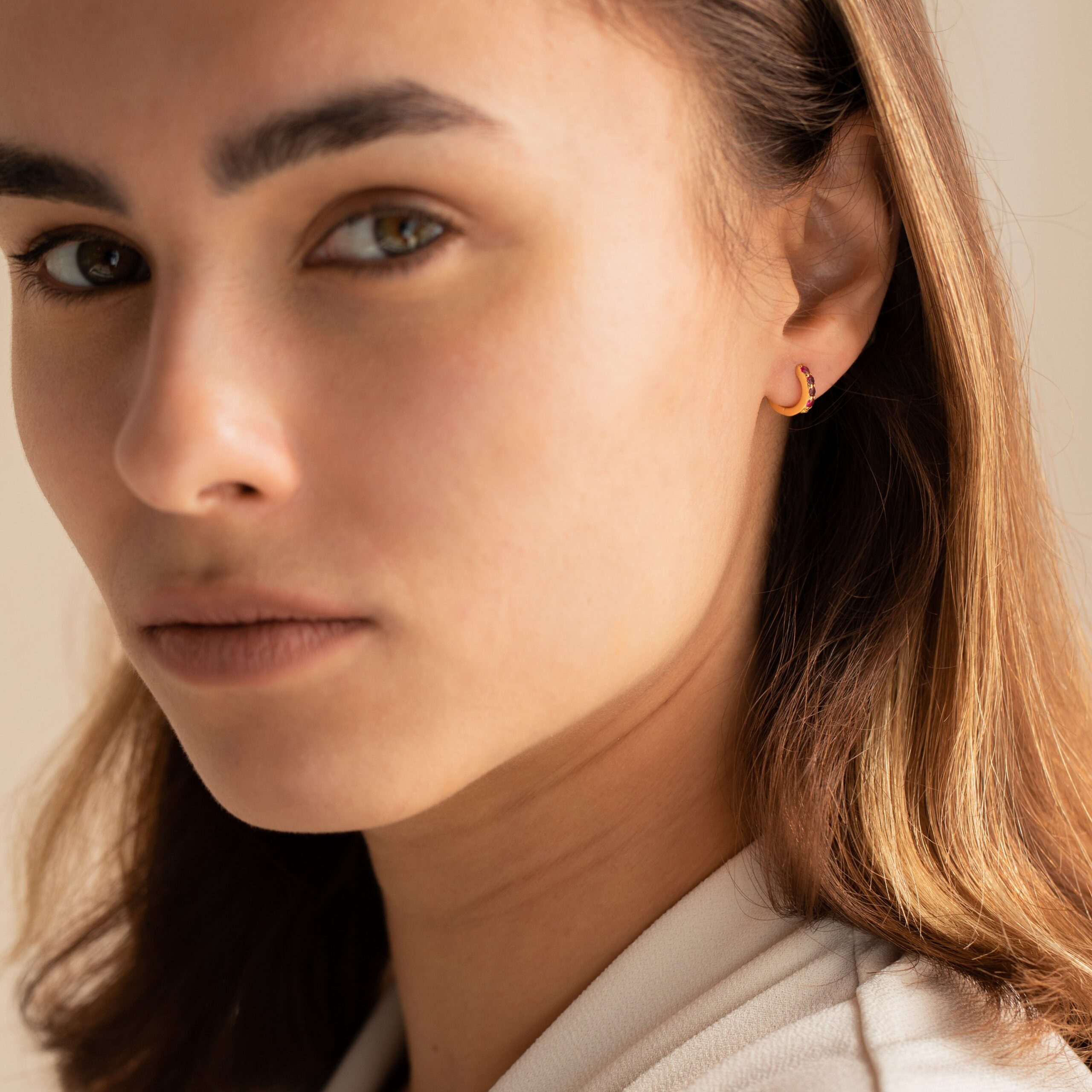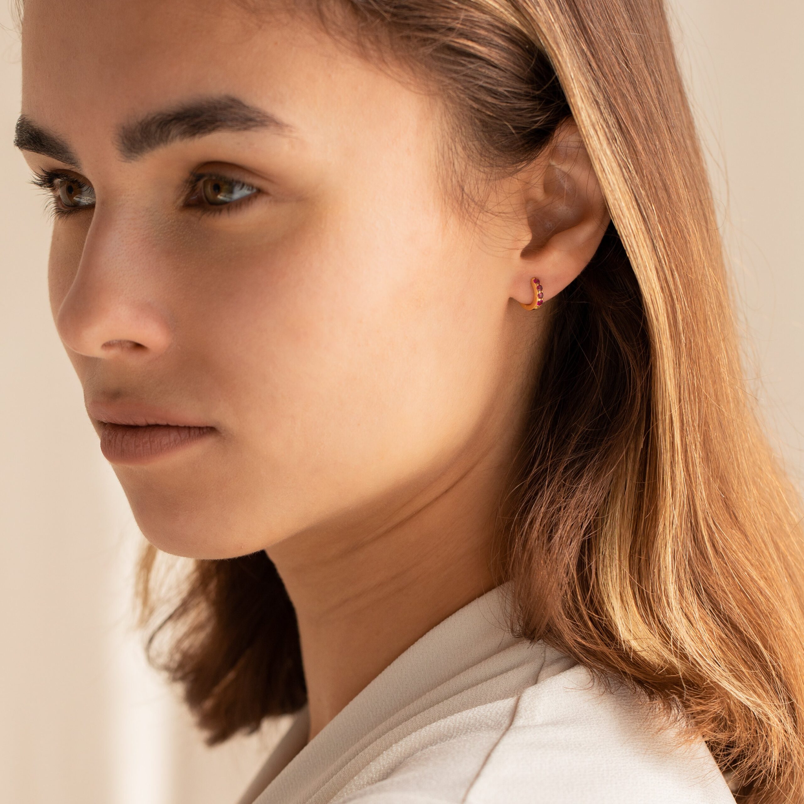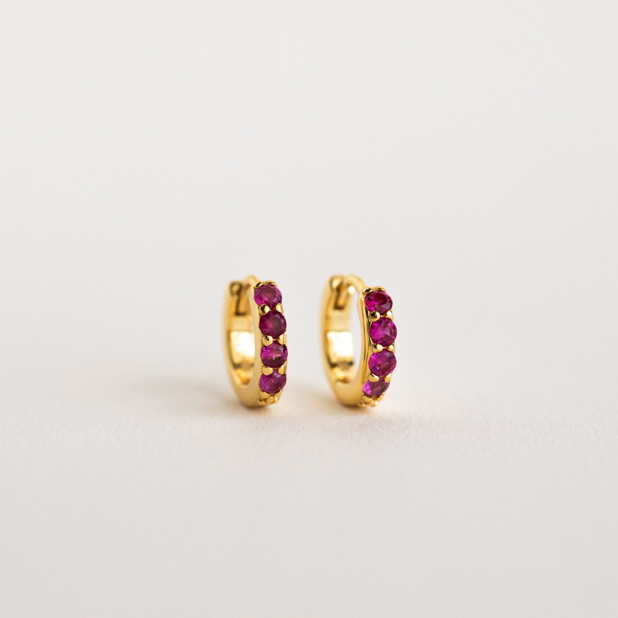 Looking for the perfect minimalist earrings? Embellished with dainty pink ruby gemstones, these huggie hoops add a unique color and sparkle to your everyday earrings.
