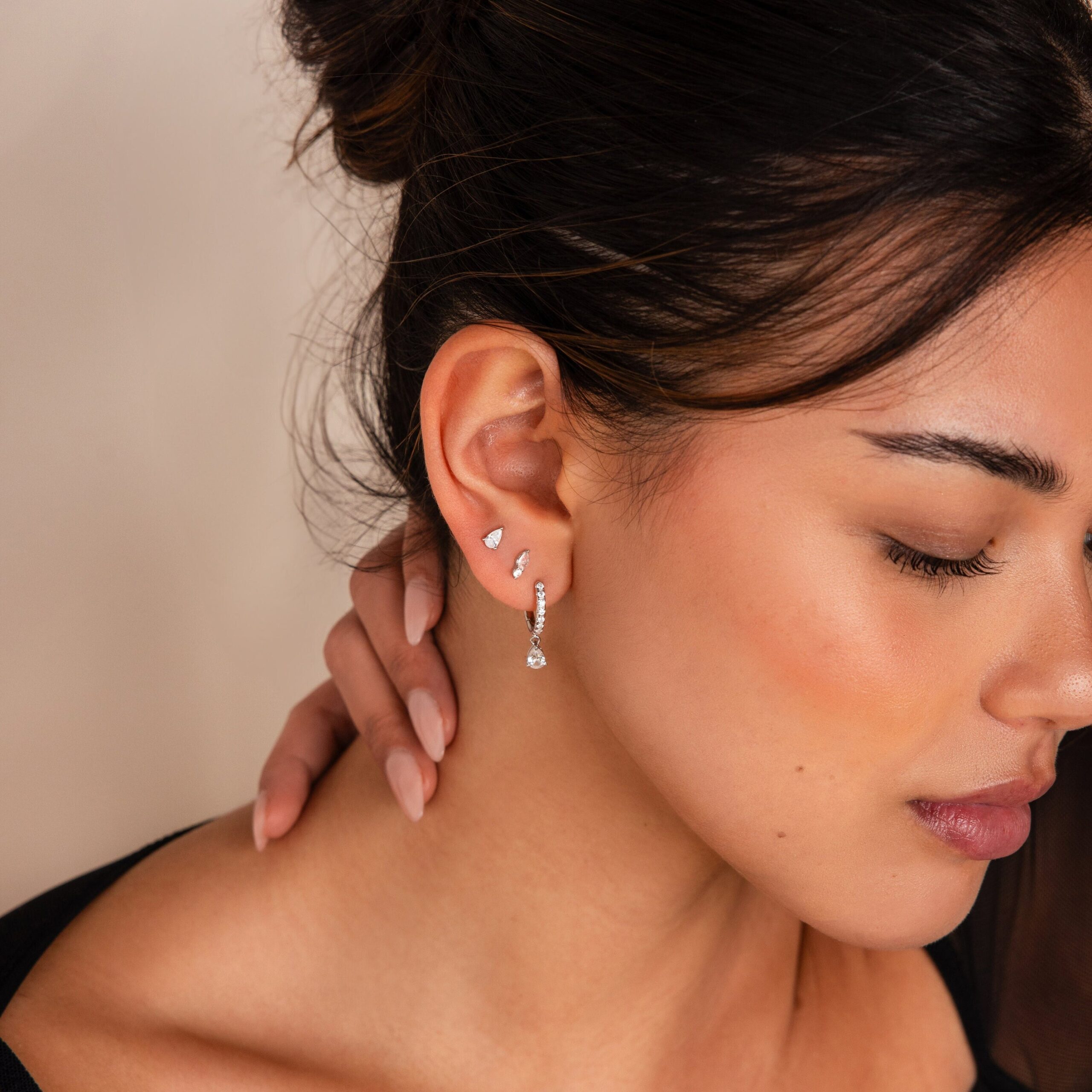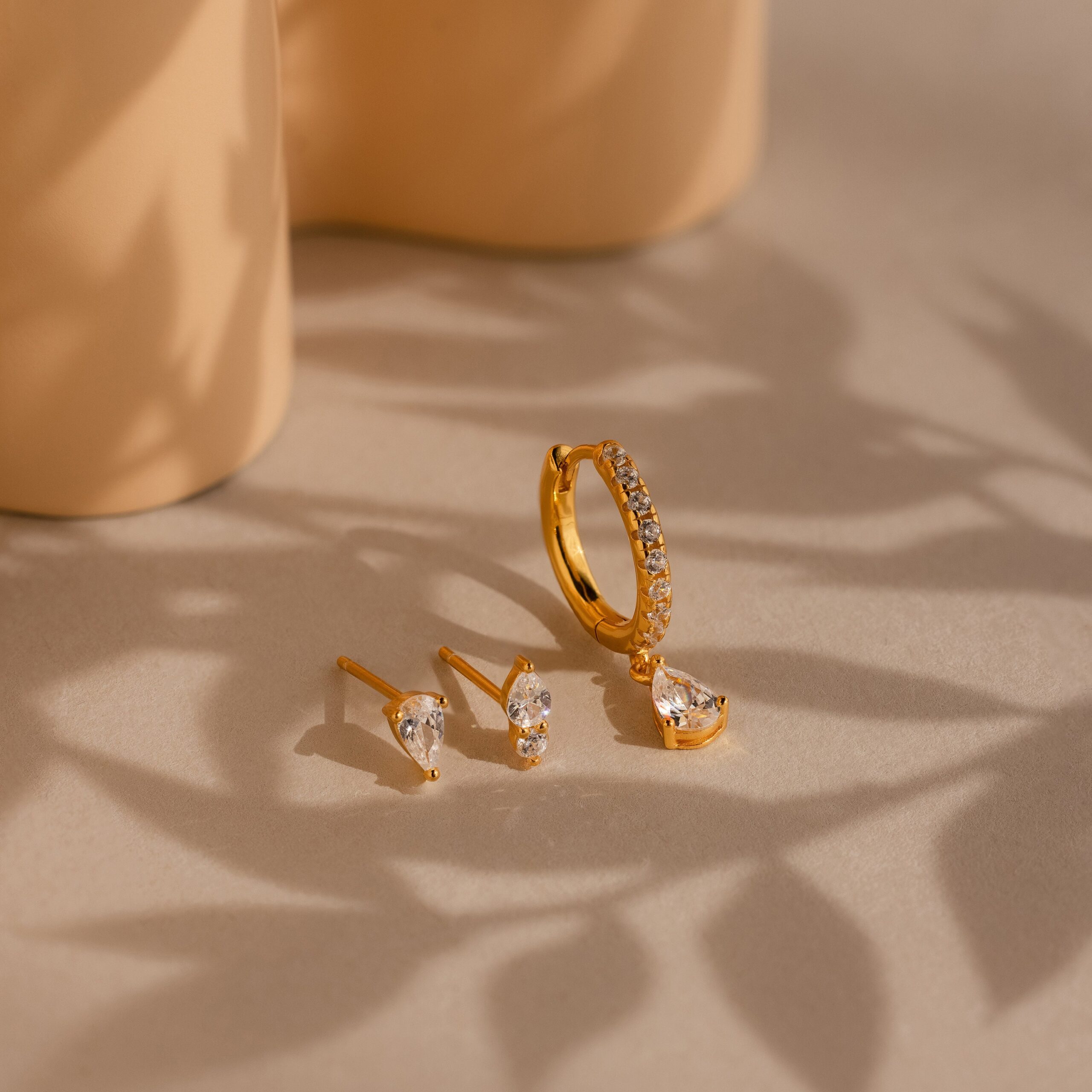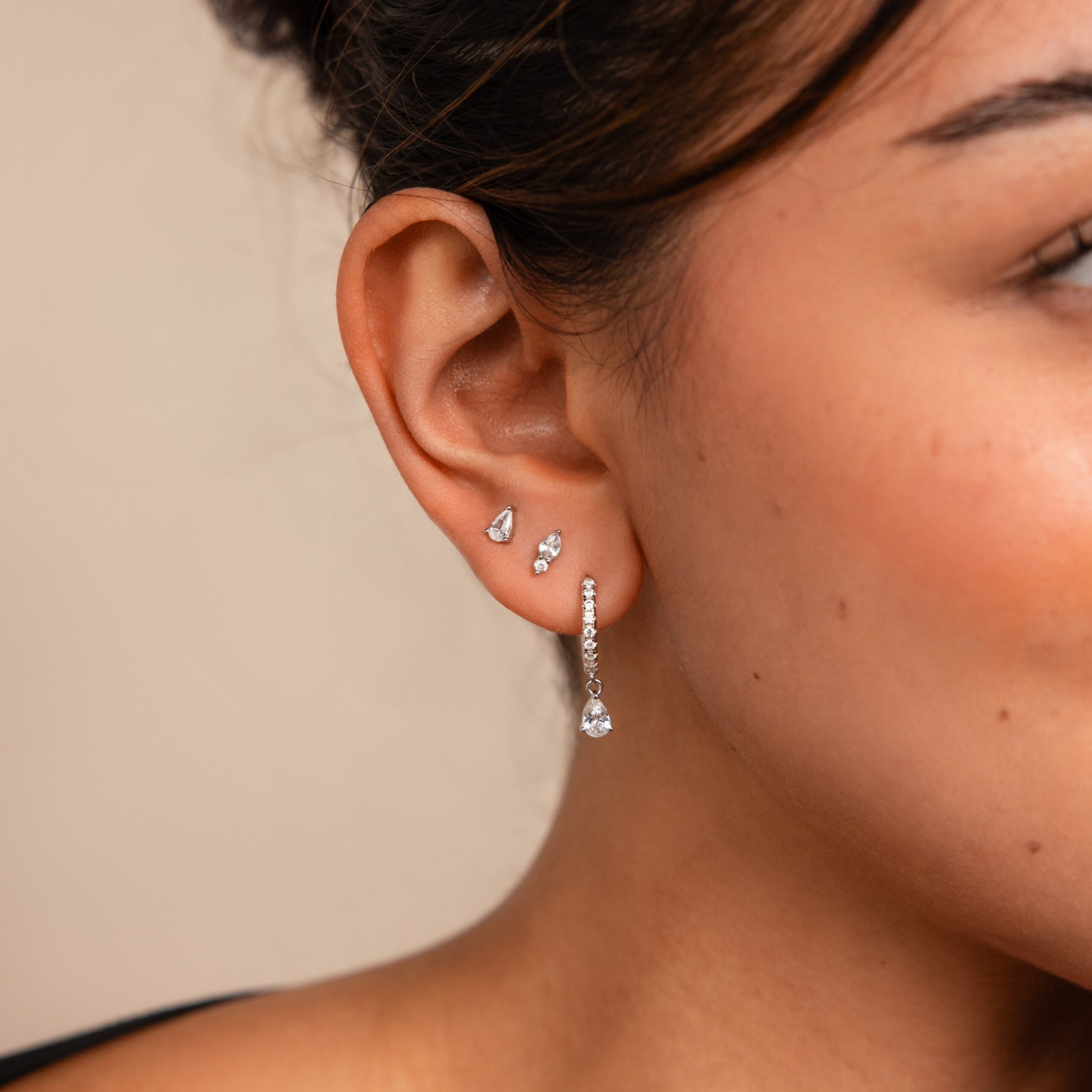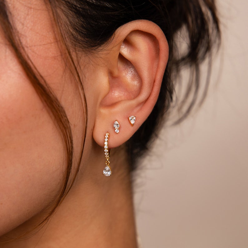 Introducing our new Teardrop Diamond Earring Set: a mesmerizing trio featuring two different Teardrop Stud Earrings and a Pave Hoop Earring adorned with a delicate dangling Teardrop Charm, exuding grace and elegance in every detail. Great for weddings or as a thoughtful present, these stunning earrings effortlessly embody timeless beauty and refined glamour, making every moment unforgettable when worn ♡