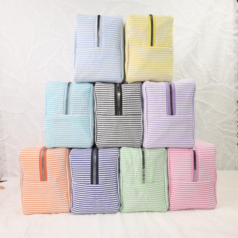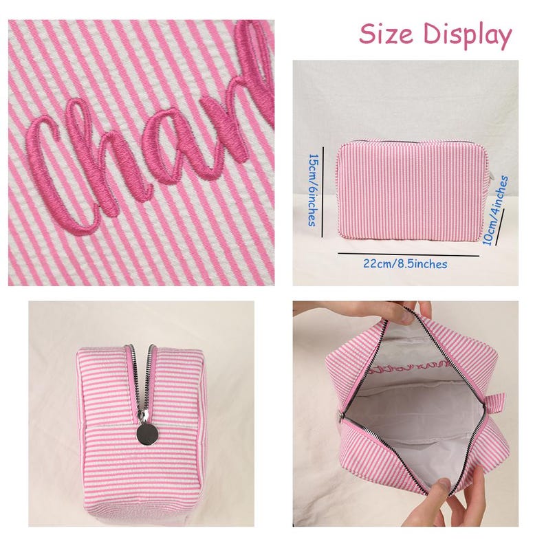 Custom Embroidered Travel Toiletry Bag, Candy Color Organizer, Striped Seersucker Cosmetic Pouch, Personalized Bridesmaid Gift for Her, Mom