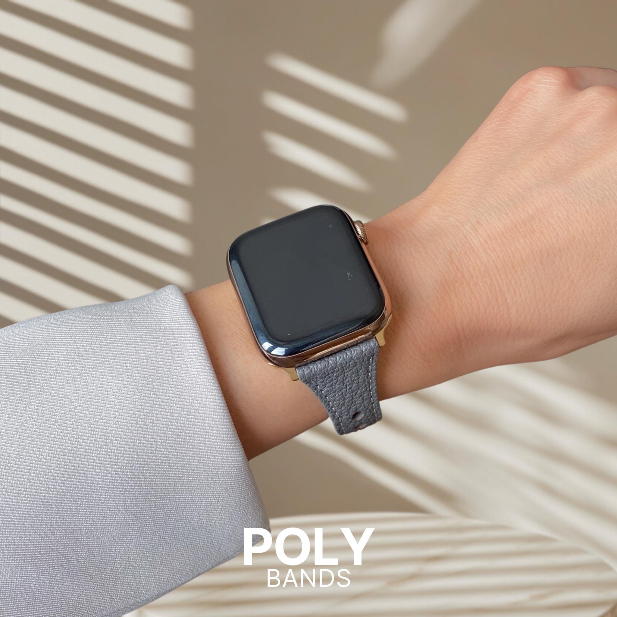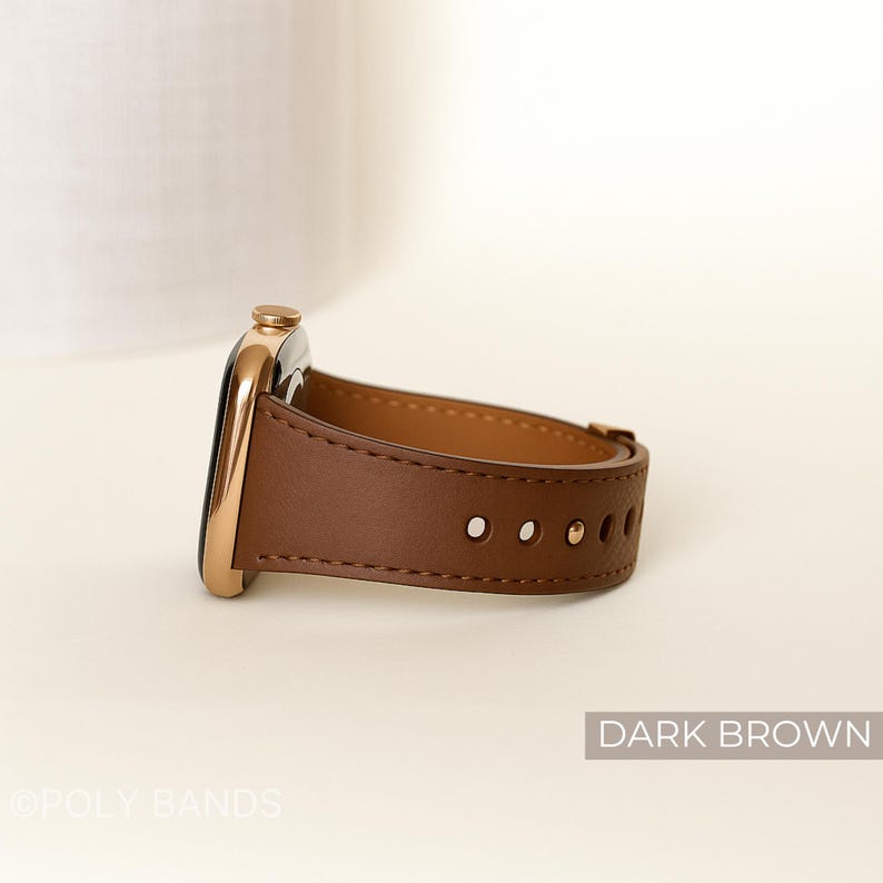 This slim leather Apple Watch band features a textured finish, contrast stitching, and rose gold-tone accents for a unique look. Made from genuine leather with a soft inner lining for comfort. Stylish, durable, and easy to wear every day.
